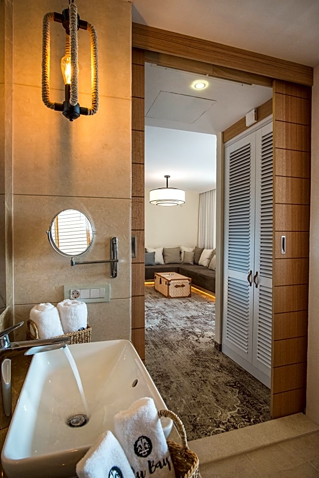 The room offers a stylish atmosphere, combining natural materials and high technology. A luxury bed with Egyptian cotton linen and feather pillows offer comfort and superb relaxation. Stunning sea view from the terrace.