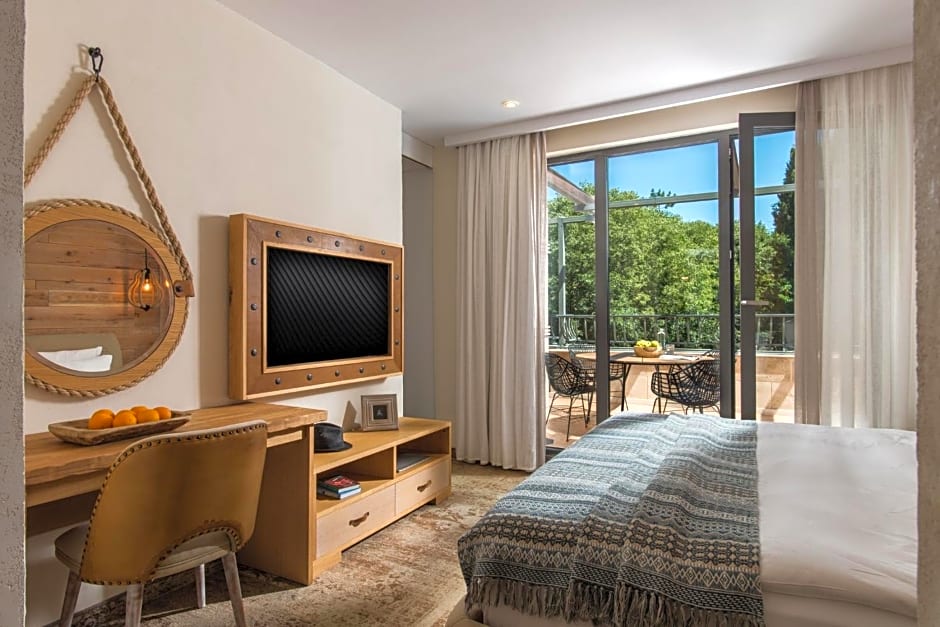 The room offers a stylish atmosphere, combining natural materials and high technology. A luxury bed with Egyptian cotton linen and feather pillows offer comfort and superb relaxation. Stunning sea view from the terrace.